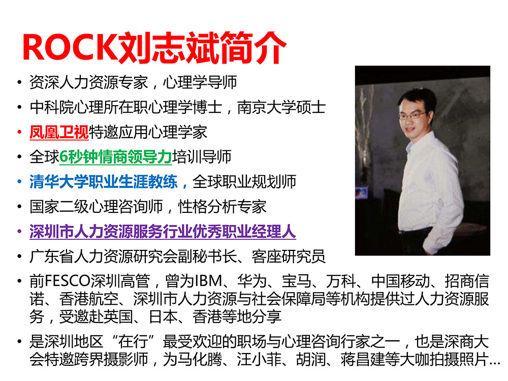 刘志斌中科院心理所在职心理学博士,全球6秒钟®情商领导力认证讲师,全球职业规划师,国家二级心理咨询师、性格测评专家,深圳市首批创业导师,广东省人力资源研究会客座研究员。第二届人力资源高峰论坛特邀讲师在分论坛二HR专场演讲PPT。